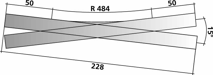 Standard kurveradier er 366, 425, 484, 543 mm (hver skinne udgør en vinkel på 30°).