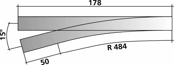 Standard kurveradier er 366, 425, 484, 543 mm (hver skinne udgør en vinkel på 30°).