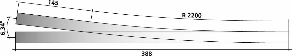 Skiftespor, venstre, 388 mm lang, 6,34 grader